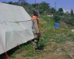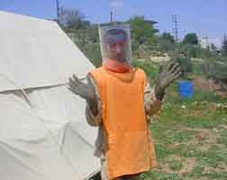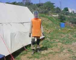 All deminers working in the OES project wear an Apron and Visor as minimum standard protective personal equipment (PPE). In addition one of the OES contractors insists that the de-miner wears safety goggles under the visor while working in the minefield. Also in theatre de-miners wear kneepads, and on occasion elbow pads and Kevlar gloves. Not all these measures are to protect the de-miner from blast injuries; some are for protection against sharp vegetation, rocks and hard ground in the minefield.