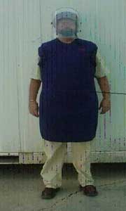 Essentially the Ballistic Apron is a compromise between wearing no body armour, and wearing a full Ballistic Suit. The first option would be unfeasible and intrinsically unsafe, and the latter uncomfortable and impractical. Therefore the option illustrated above allows for protection to the torso, abdominal area and the thigh area, but to the front of the body only. Little protection is offered to the deminer to the sides or back of the body. This equipment is a compromise situation; meeting the minimum standards and retaining flexibility and ease of movement. The de-miner is given protection from the proposed threat while still allowing flexibility and a degree of air circulation which is important in this theatre where temperatures in summer can reach the early 40’s.